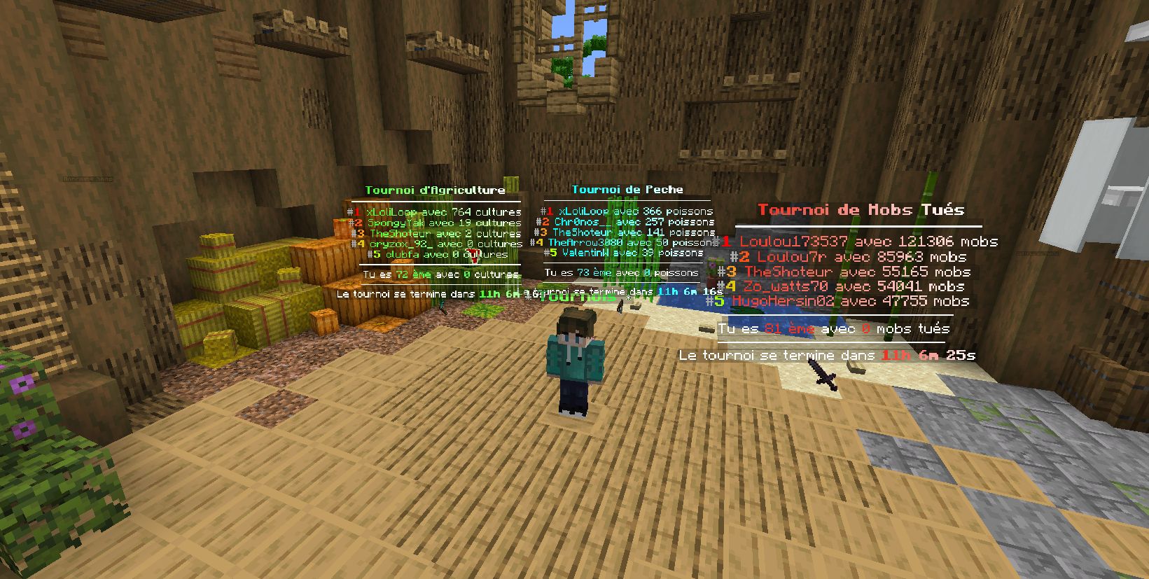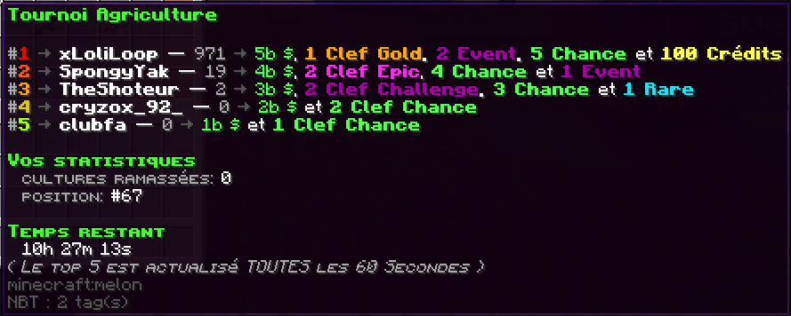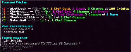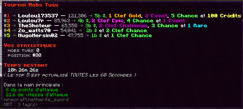 Pour voir le classement d'un des tournois, il vous suffit de passer votre curseur sur la pastèque, sur l'épée en netherite ou sur la canne à pêche.